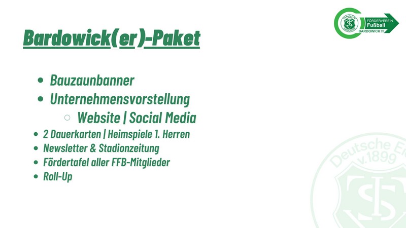 Hier ist das Sponsoringpaket „Teamsponsor Grün & Weiß“ beschrieben. Es umfasst folgende Leistungen des Vereins.