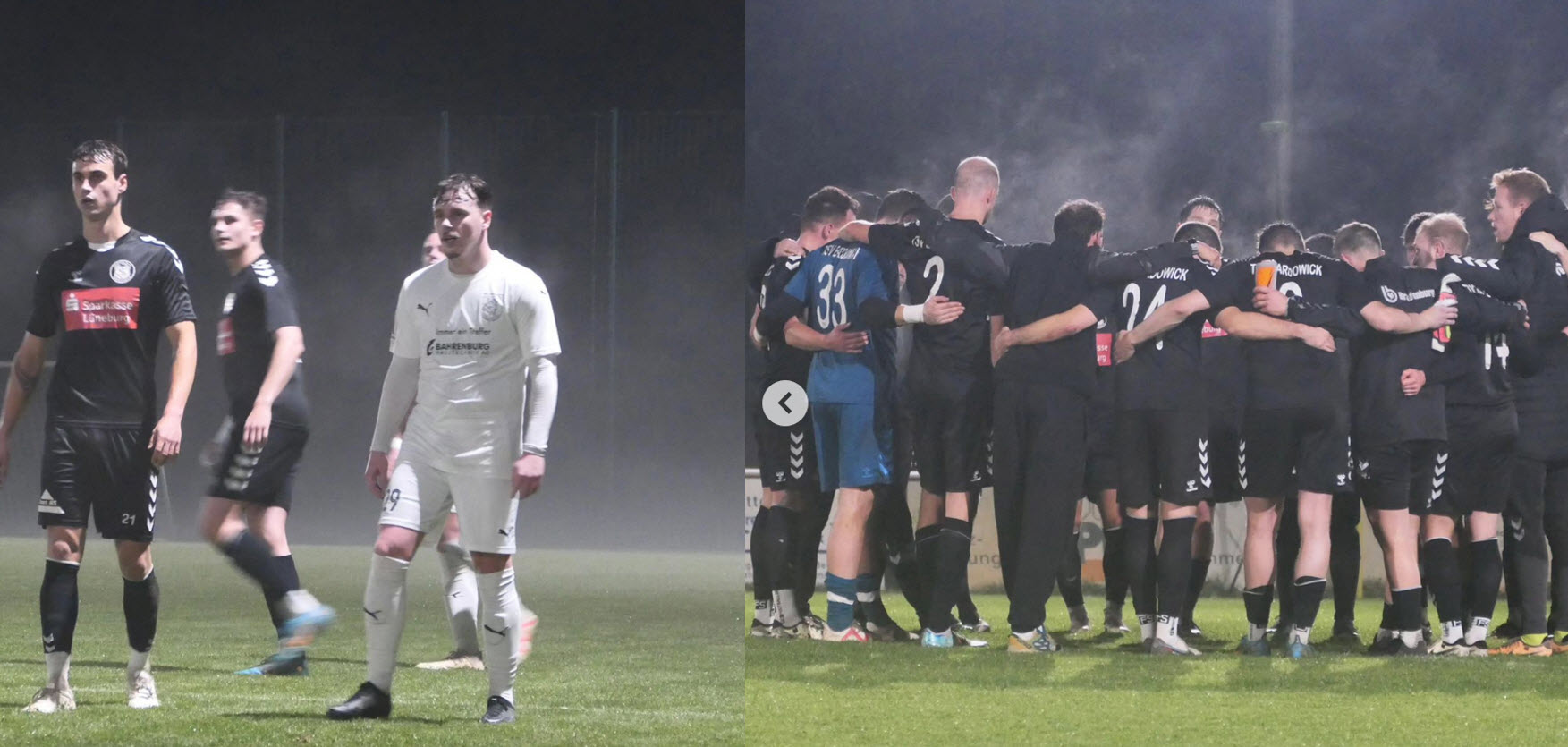 Lennart Ahrens und Tim Kathmann (links) Abschlusskreis nach Abpfiff (rechts)